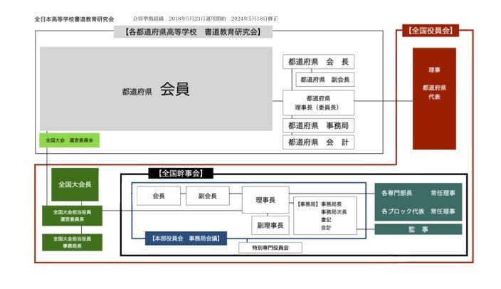 本申し合わせは、全日本高等学校書道教育研究会(以下、「本部」と記述)が主催する全国大会の開催にあたり、開催都道府県と本部間の役割分担、申請手続き、運営方法、報告事項などを明確に定めた申合せ事項の改訂更新版で2024年川崎特別大会、2025年和歌山大会、2026富山大会運営の内容が反映されています。